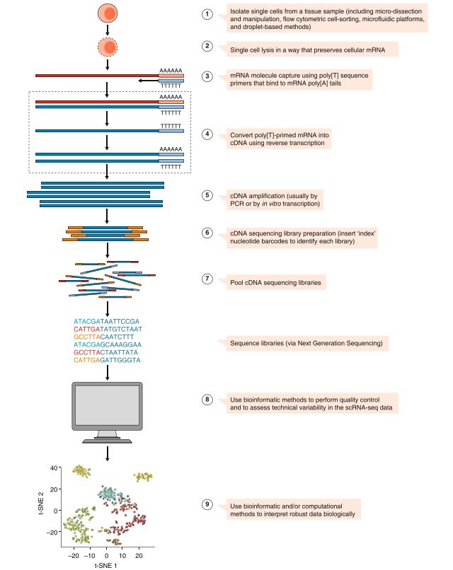 理論上說,任何的真核細(xì)胞都可以進(jìn)行scRNA-seq檢測(cè)。但在實(shí)際操作過程中,需要注意的是:1)從組織(特別是實(shí)體組織)中獲得細(xì)胞的數(shù)量和活性;2) 在獲取過程中人為操作對(duì)細(xì)胞轉(zhuǎn)錄組的影響,以避免出現(xiàn)人為因素的轉(zhuǎn)錄表達(dá)變化。當(dāng)然從技術(shù)上說,除了分離單個(gè)細(xì)胞進(jìn)行檢測(cè)外,還可以直接分離細(xì)胞核(nuclei)進(jìn)行測(cè)序。