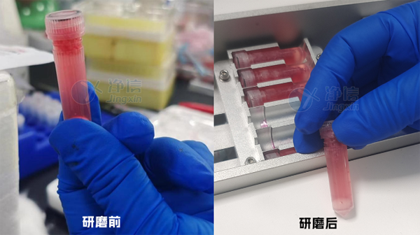 小鼠肺組織樣品的前處理研磨實(shí)驗(yàn)前后效果圖